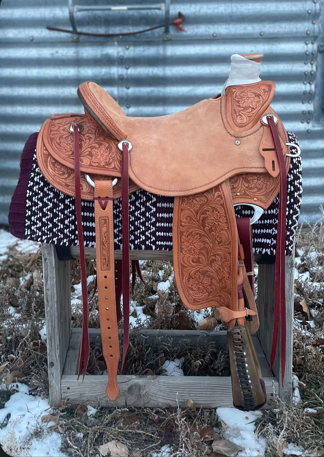 Custom saddles by Matt Cazier are built by hand from the ground up, starting with a handmade tree built by Randy Alexander or Joe Bramwell, that fits the rider’s type of horse, and the best leather money can buy. Clients can customize every aspect of their saddle from tooling to the shape of the ground seat. All saddles are crafted with the comfort of the horse and rider in mind. Our saddles are built with such balance you will be able to put in a full day’s work whether it be on the range or in the arena.